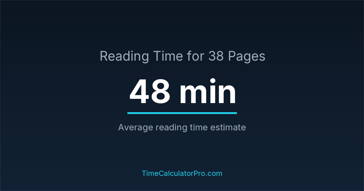 If you read at an average speed of 200 words per minute, reading 38 pages will take approximately 0 hours and 48 minutes. This estimate assumes around 250 words per page, which is typical for most books.