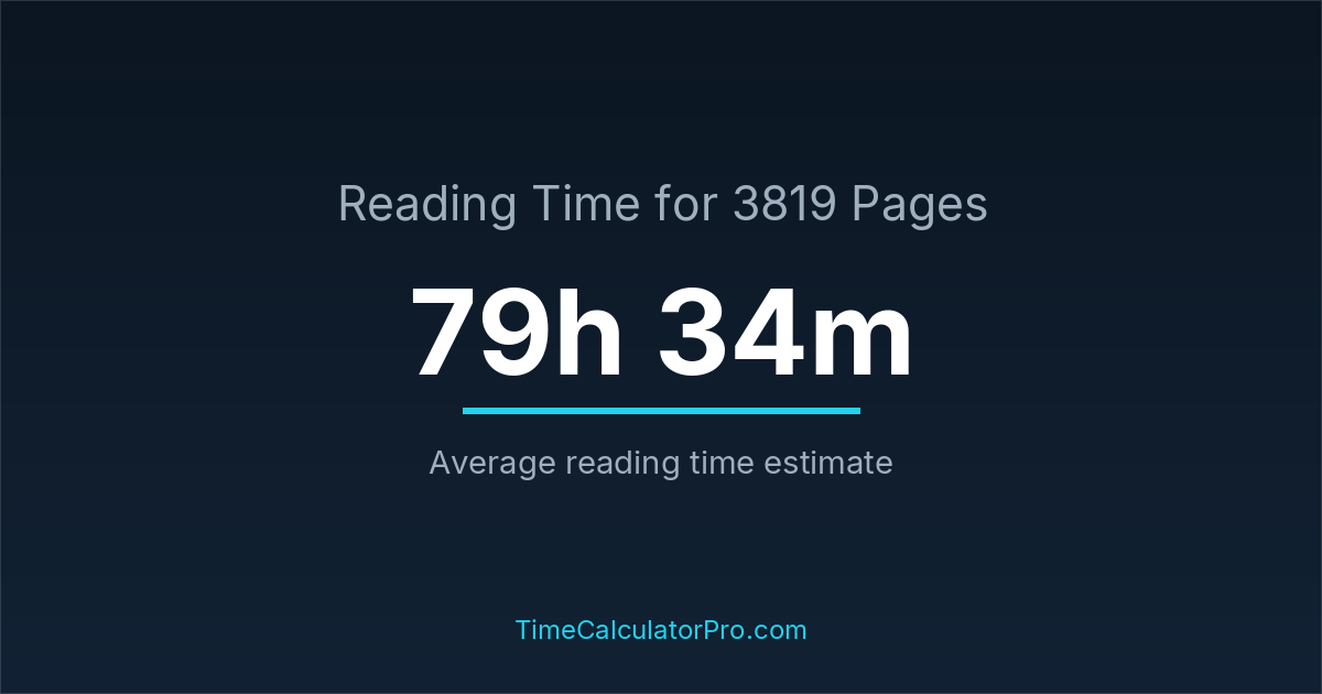 If you read at an average speed of 200 words per minute, reading 3819 pages will take approximately 79 hours and 34 minutes. This estimate assumes around 250 words per page, which is typical for most books.