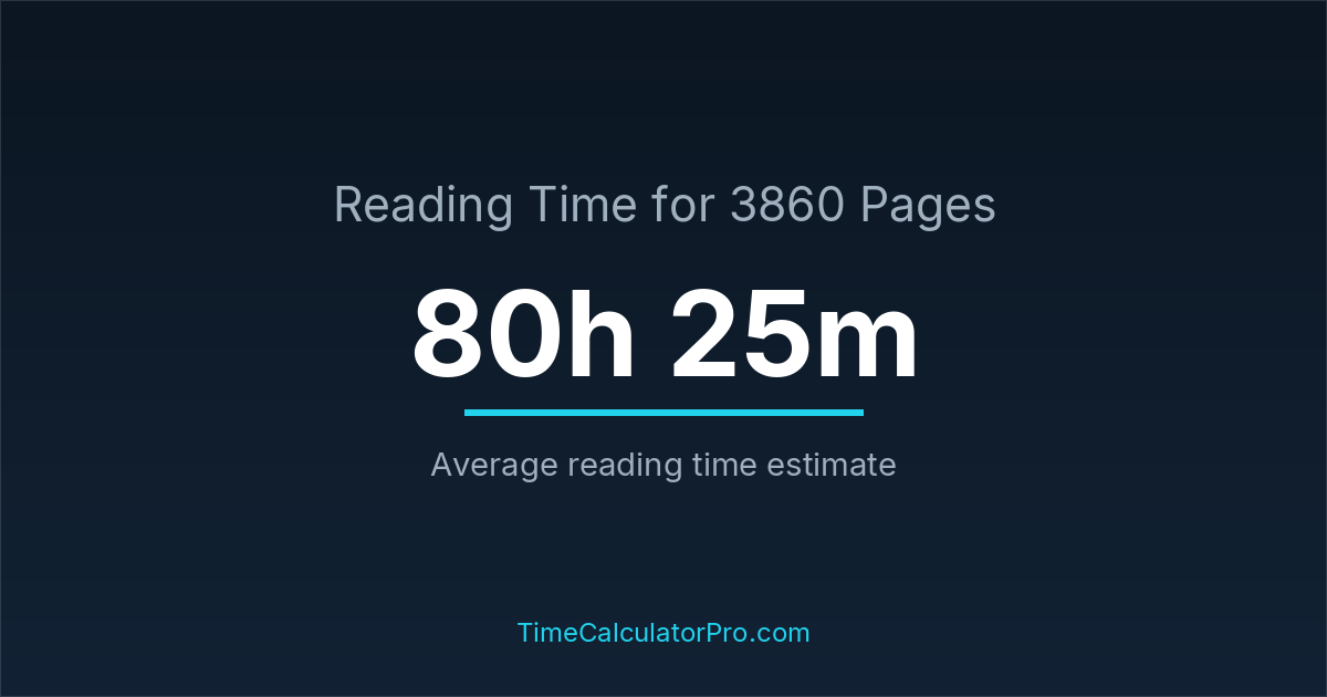 If you read at an average speed of 200 words per minute, reading 3860 pages will take approximately 80 hours and 25 minutes. This estimate assumes around 250 words per page, which is typical for most books.