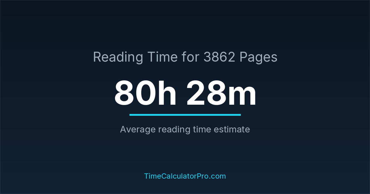 If you read at an average speed of 200 words per minute, reading 3862 pages will take approximately 80 hours and 28 minutes. This estimate assumes around 250 words per page, which is typical for most books.