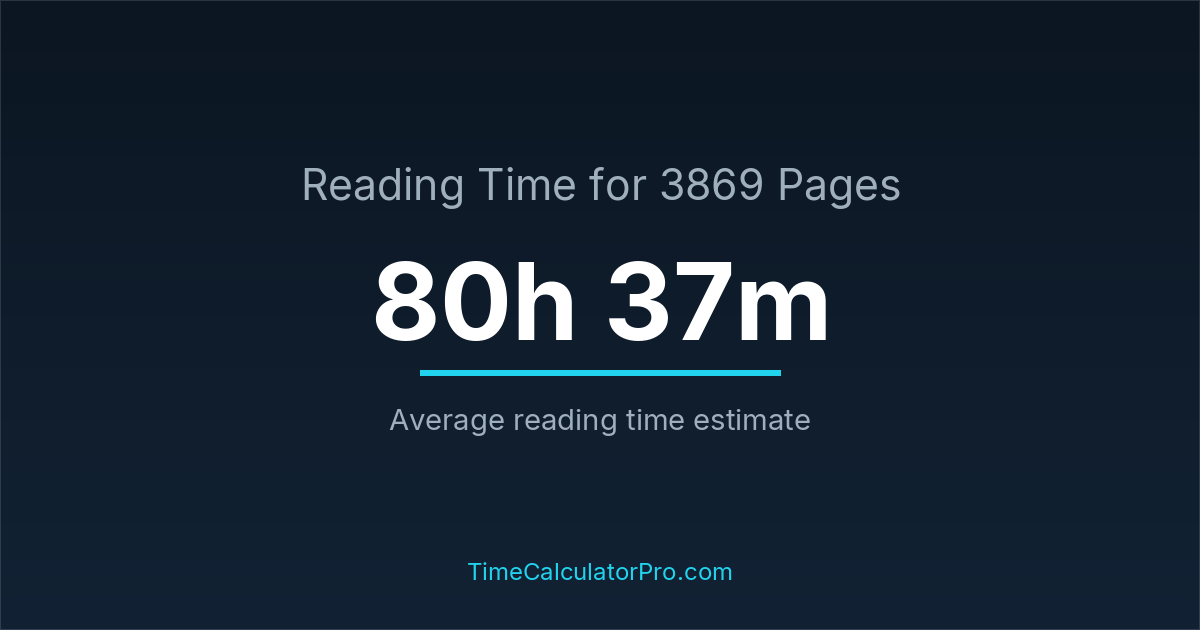 If you read at an average speed of 200 words per minute, reading 3869 pages will take approximately 80 hours and 37 minutes. This estimate assumes around 250 words per page, which is typical for most books.