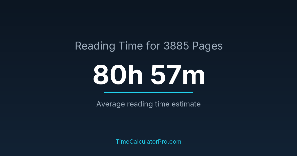 If you read at an average speed of 200 words per minute, reading 3885 pages will take approximately 80 hours and 57 minutes. This estimate assumes around 250 words per page, which is typical for most books.