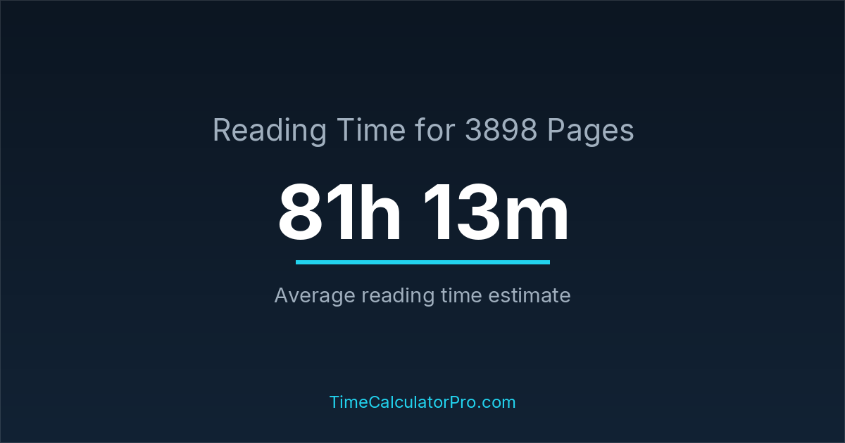 If you read at an average speed of 200 words per minute, reading 3898 pages will take approximately 81 hours and 13 minutes. This estimate assumes around 250 words per page, which is typical for most books.