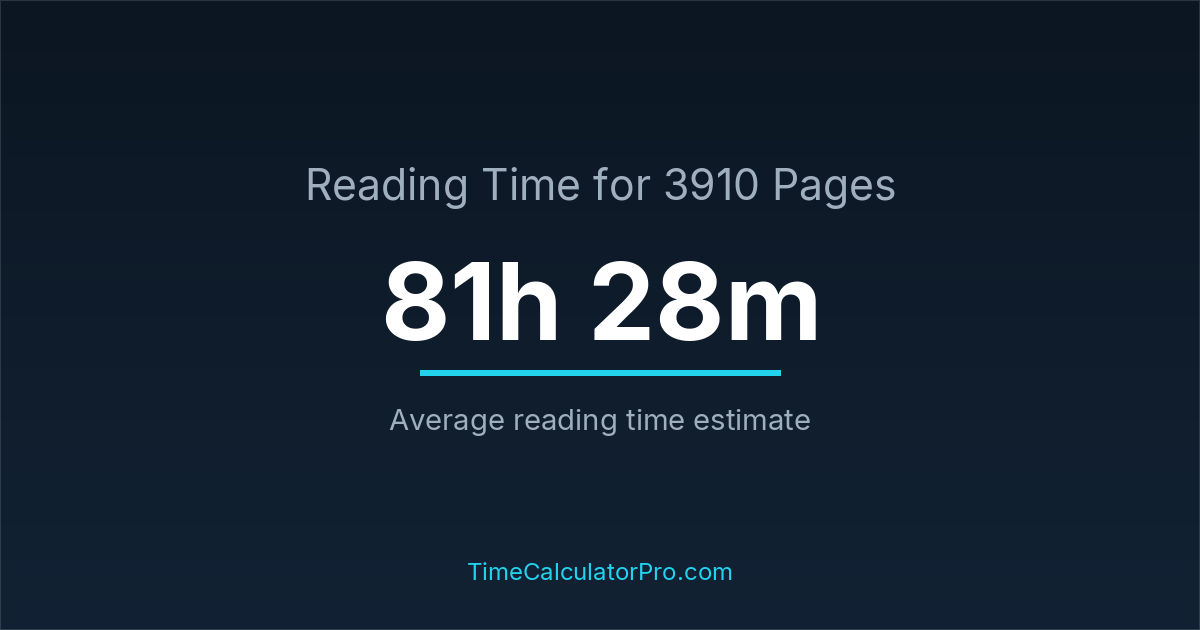 If you read at an average speed of 200 words per minute, reading 3910 pages will take approximately 81 hours and 28 minutes. This estimate assumes around 250 words per page, which is typical for most books.