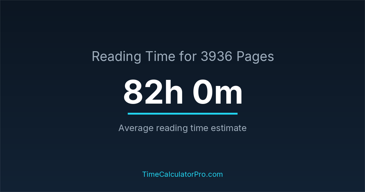Reading 3936 pages usually takes approximately 82 hours and 0 minutes for the average reader, though this can vary depending on concentration and reading habits.