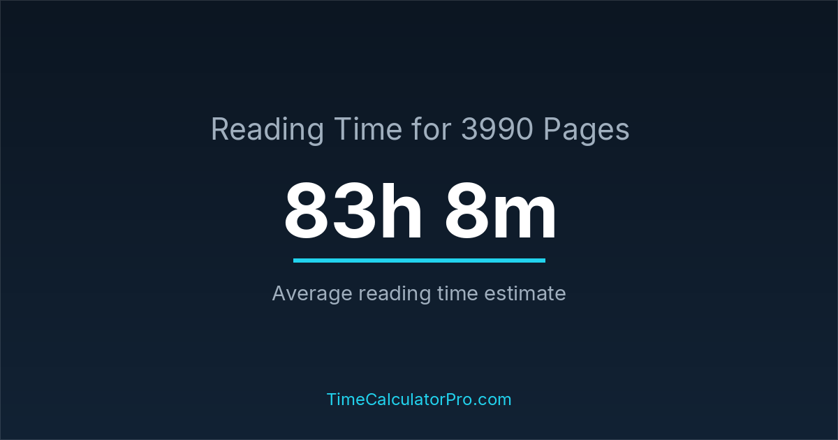 If you read at an average speed of 200 words per minute, reading 3990 pages will take approximately 83 hours and 8 minutes. This estimate assumes around 250 words per page, which is typical for most books.