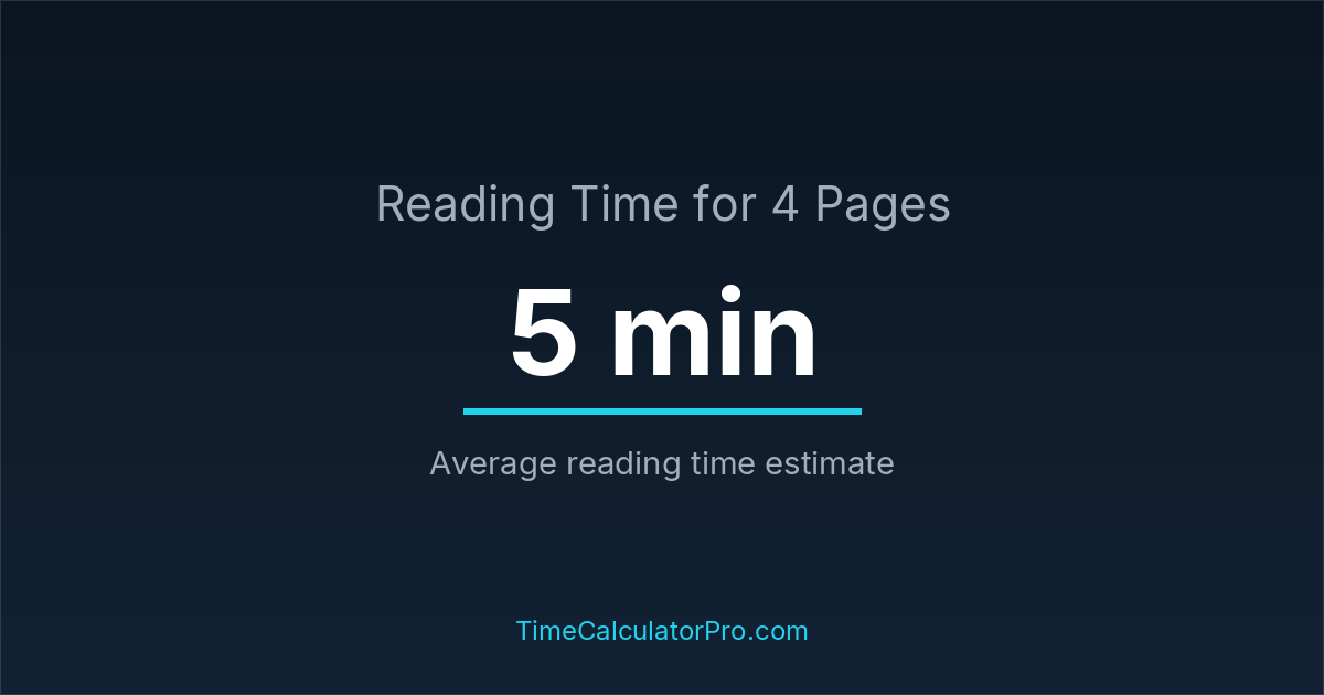 If you read at an average speed of 200 words per minute, reading 4 pages will take approximately 0 hours and 5 minutes. This estimate assumes around 250 words per page, which is typical for most books.