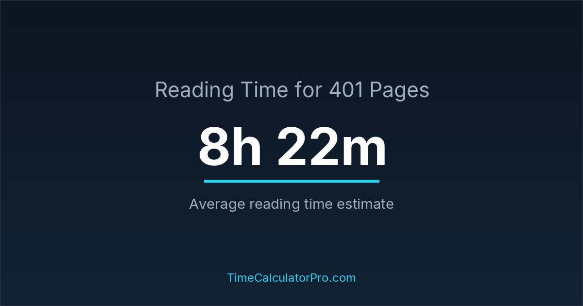 The estimated time to read 401 pages is approximately 8 hours and 22 minutes for an average adult reader.