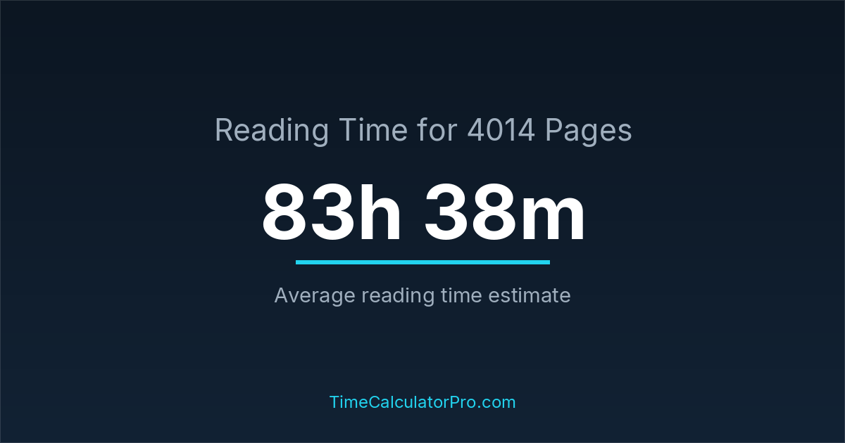 If you read at an average speed of 200 words per minute, reading 4014 pages will take approximately 83 hours and 38 minutes. This estimate assumes around 250 words per page, which is typical for most books.