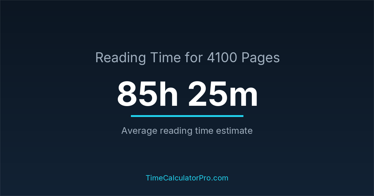 If you read at an average speed of 200 words per minute, reading 4100 pages will take approximately 85 hours and 25 minutes. This estimate assumes around 250 words per page, which is typical for most books.