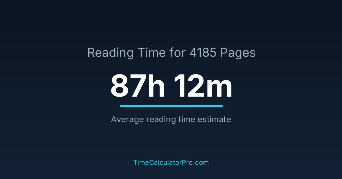 If you read at an average speed of 200 words per minute, reading 4185 pages will take approximately 87 hours and 12 minutes. This estimate assumes around 250 words per page, which is typical for most books.