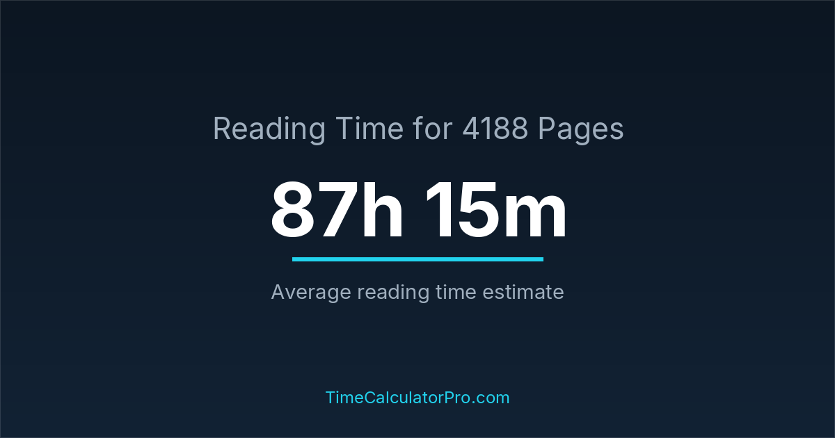 If you read at an average speed of 200 words per minute, reading 4188 pages will take approximately 87 hours and 15 minutes. This estimate assumes around 250 words per page, which is typical for most books.