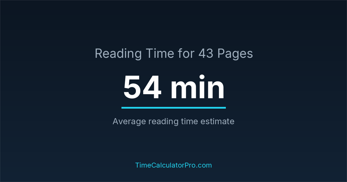 If you read at an average speed of 200 words per minute, reading 43 pages will take approximately 0 hours and 54 minutes. This estimate assumes around 250 words per page, which is typical for most books.