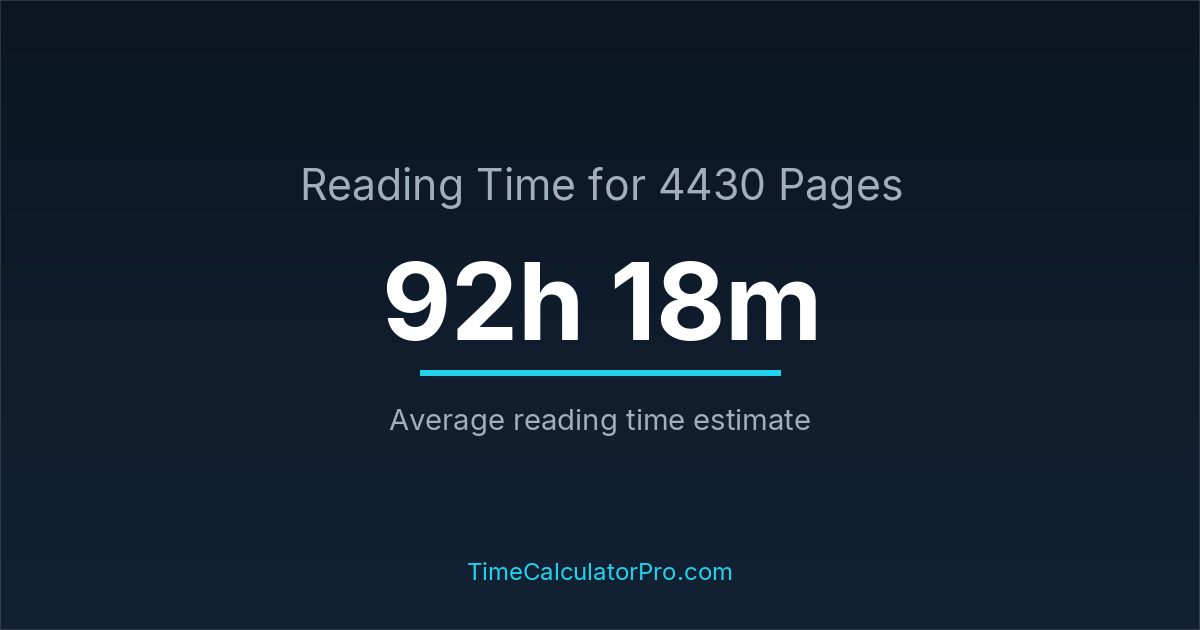 Based on standard reading speeds, reading 4430 pages would take roughly 92 hours and 18 minutes under normal conditions.