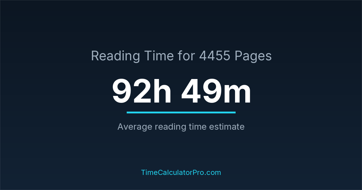 On average, reading 4455 pages may require about 92 hours and 49 minutes for most readers, assuming a standard reading pace and moderate difficulty.