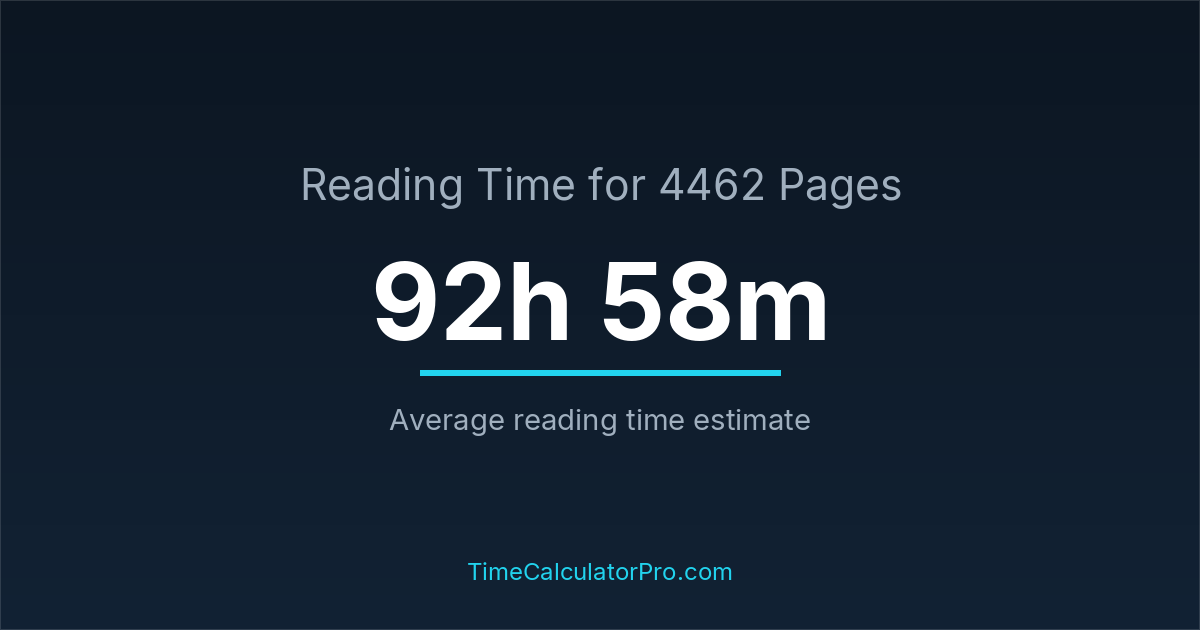 If you read at an average speed of 200 words per minute, reading 4462 pages will take approximately 92 hours and 58 minutes. This estimate assumes around 250 words per page, which is typical for most books.
