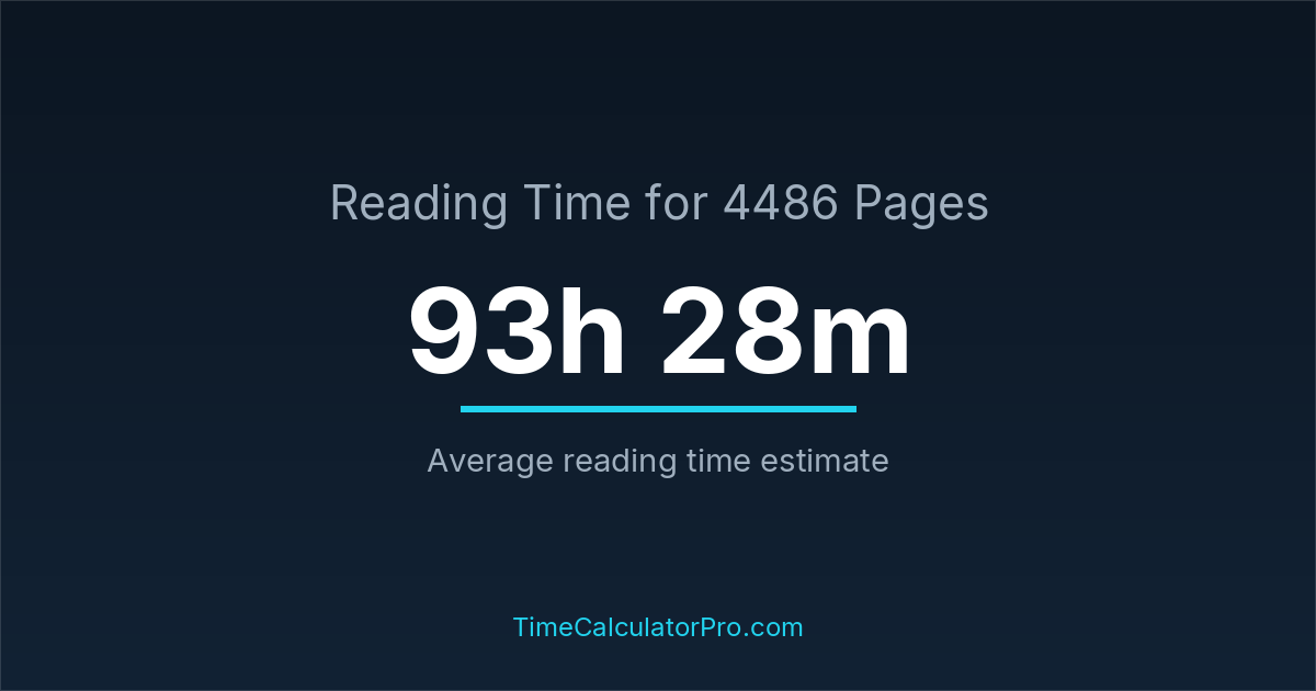 If you are wondering how long it takes to read 4486 pages, the estimated reading time is roughly 93 hours and 28 minutes based on common reading speed averages.