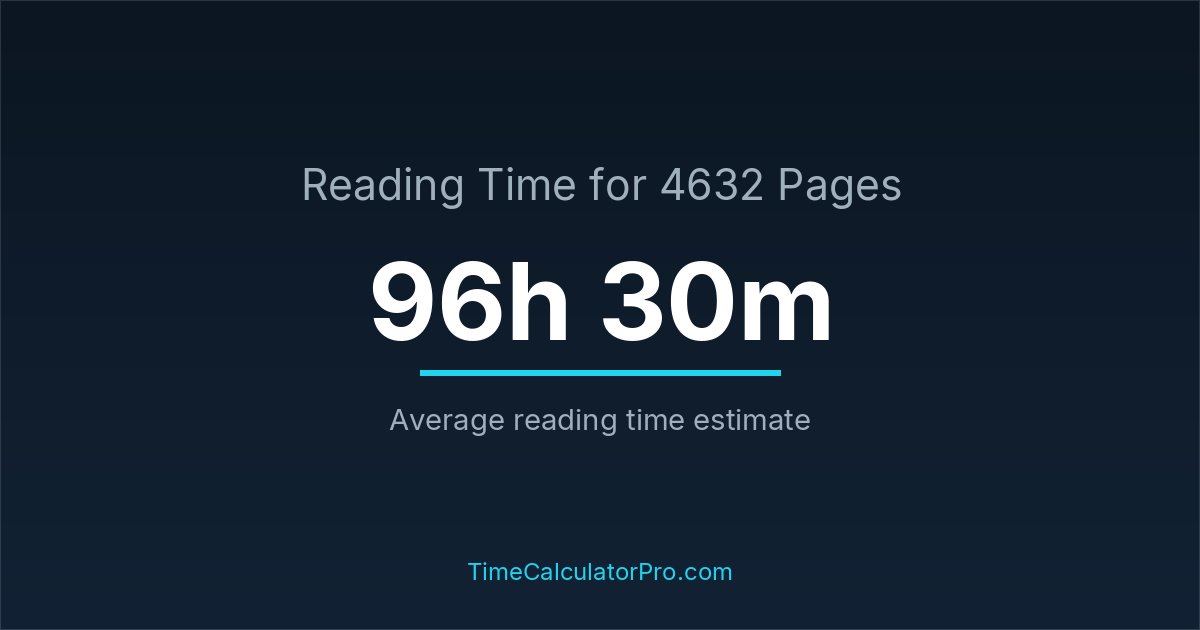 If you are wondering how long it takes to read 4632 pages, the estimated reading time is roughly 96 hours and 30 minutes based on common reading speed averages.