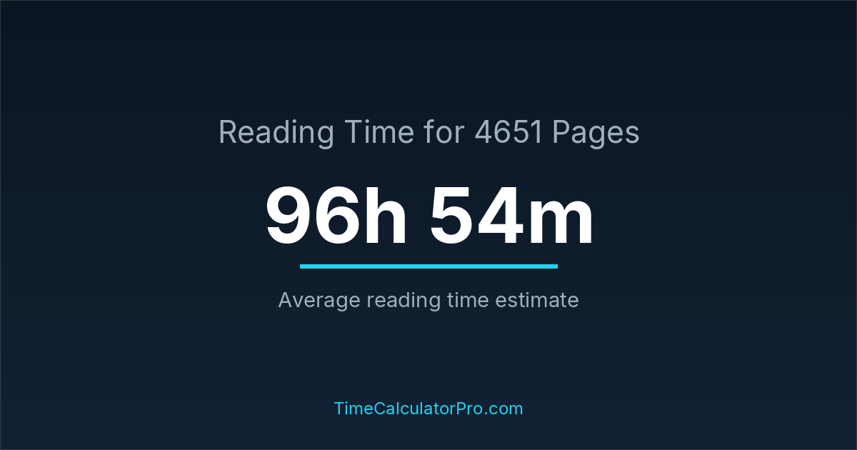 If you read at an average speed of 200 words per minute, reading 4651 pages will take approximately 96 hours and 54 minutes. This estimate assumes around 250 words per page, which is typical for most books.