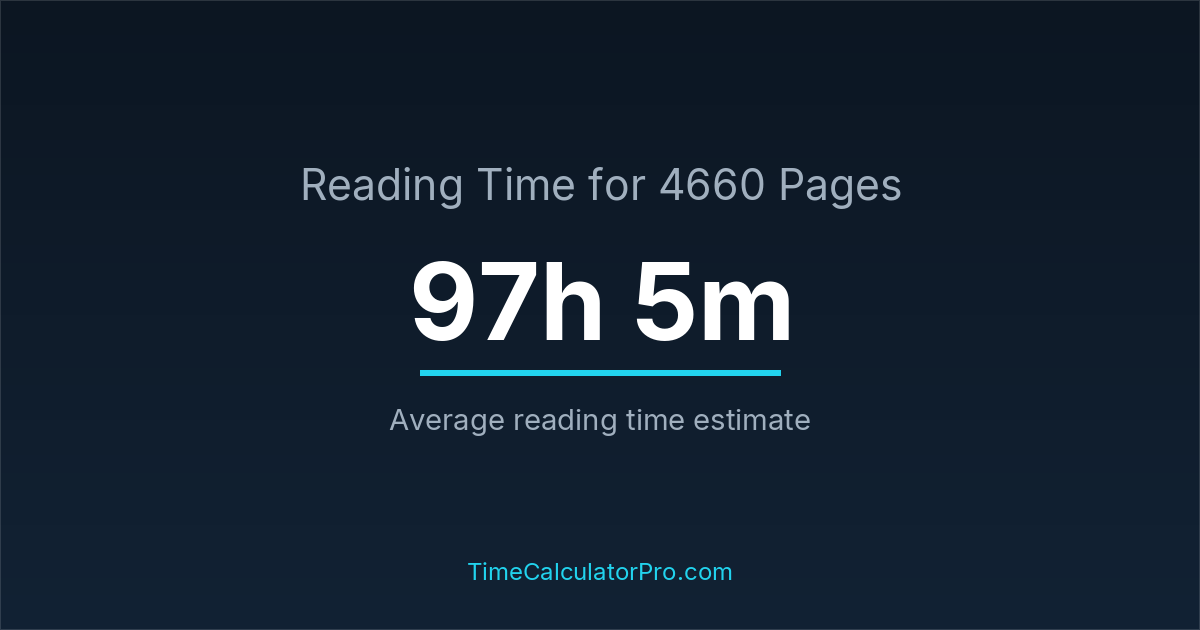 Reading 4660 pages usually takes approximately 97 hours and 5 minutes for the average reader, though this can vary depending on concentration and reading habits.