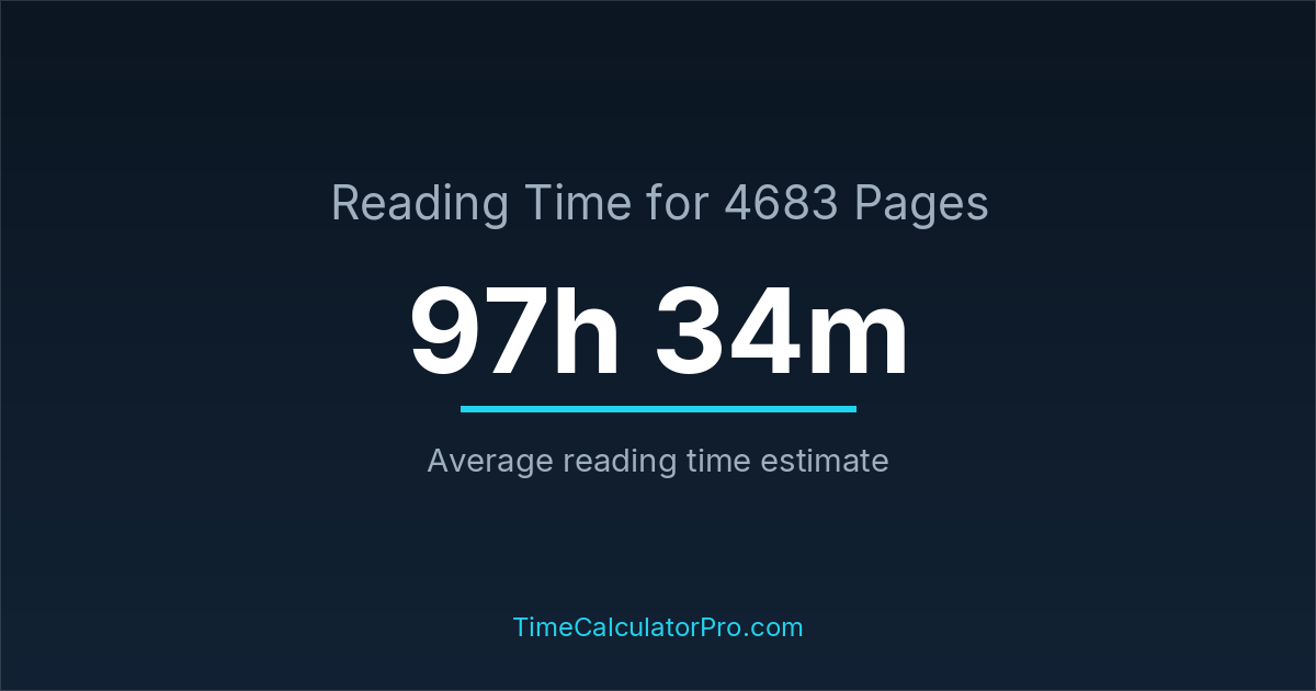 If you read at an average speed of 200 words per minute, reading 4683 pages will take approximately 97 hours and 34 minutes. This estimate assumes around 250 words per page, which is typical for most books.