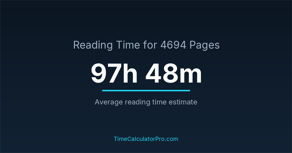 If you read at an average speed of 200 words per minute, reading 4694 pages will take approximately 97 hours and 48 minutes. This estimate assumes around 250 words per page, which is typical for most books.