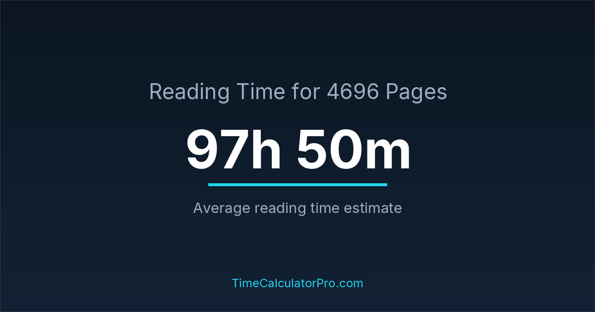 If you read at an average speed of 200 words per minute, reading 4696 pages will take approximately 97 hours and 50 minutes. This estimate assumes around 250 words per page, which is typical for most books.