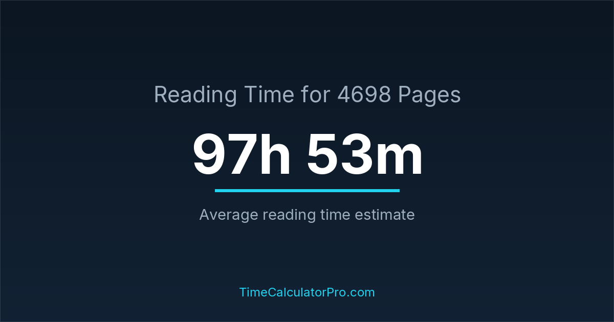If you read at an average speed of 200 words per minute, reading 4698 pages will take approximately 97 hours and 53 minutes. This estimate assumes around 250 words per page, which is typical for most books.