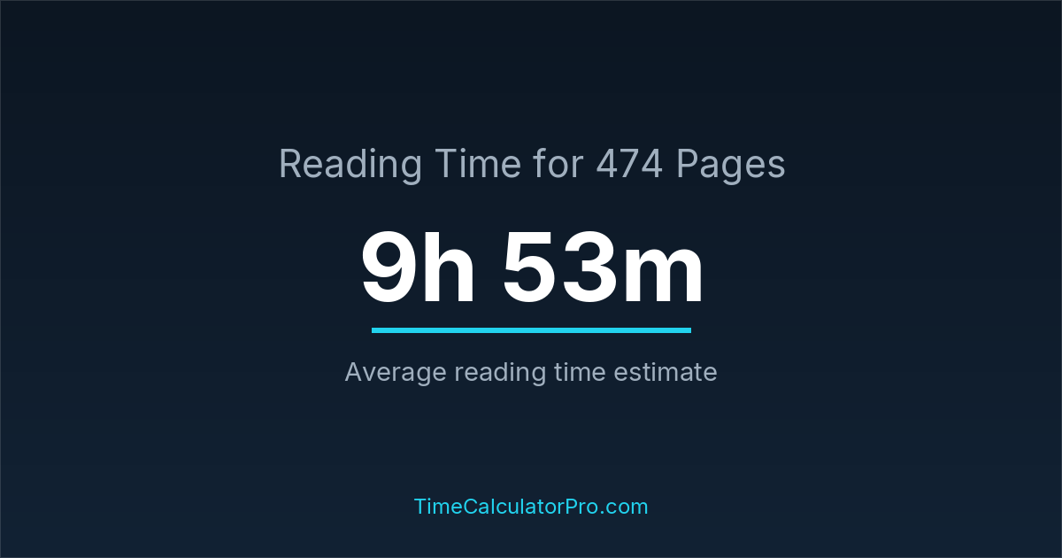 If you read at an average speed of 200 words per minute, reading 474 pages will take approximately 9 hours and 53 minutes. This estimate assumes around 250 words per page, which is typical for most books.