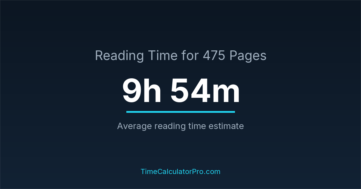 If you read at an average speed of 200 words per minute, reading 475 pages will take approximately 9 hours and 54 minutes. This estimate assumes around 250 words per page, which is typical for most books.