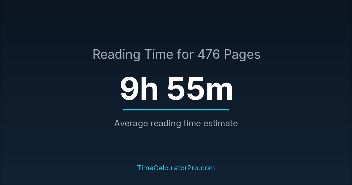 Reading 476 pages usually takes approximately 9 hours and 55 minutes for the average reader, though this can vary depending on concentration and reading habits.
