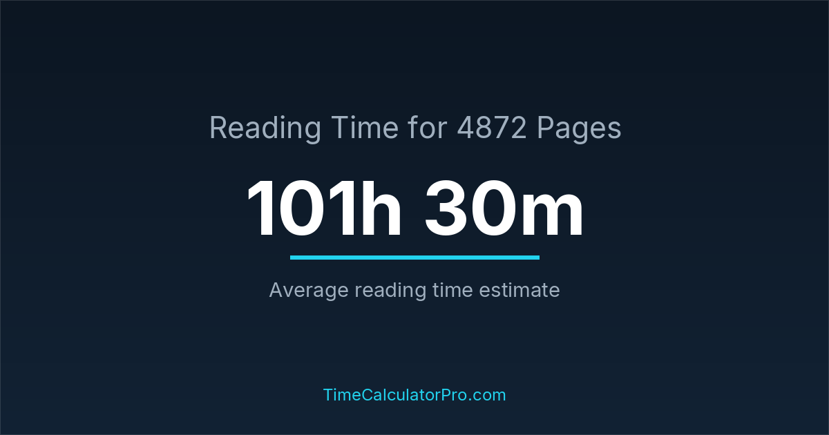 If you are wondering how long it takes to read 4872 pages, the estimated reading time is roughly 101 hours and 30 minutes based on common reading speed averages.