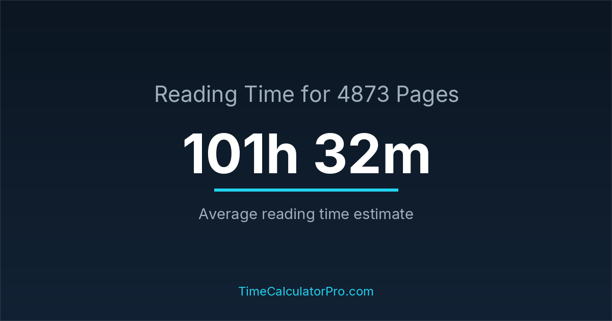 If you read at an average speed of 200 words per minute, reading 4873 pages will take approximately 101 hours and 32 minutes. This estimate assumes around 250 words per page, which is typical for most books.