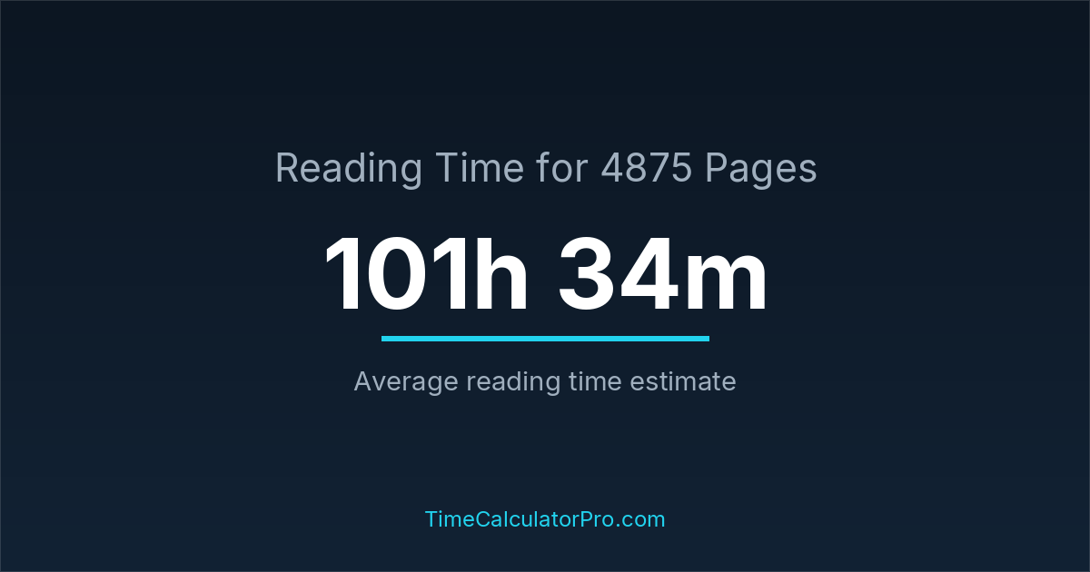 If you read at an average speed of 200 words per minute, reading 4875 pages will take approximately 101 hours and 34 minutes. This estimate assumes around 250 words per page, which is typical for most books.