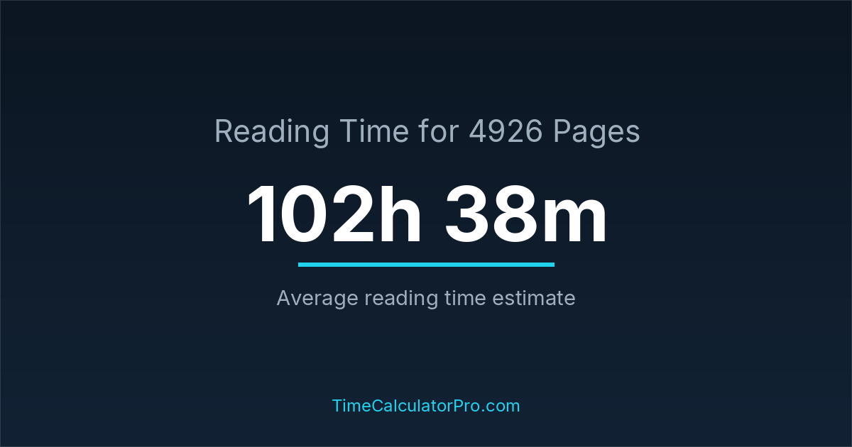 If you read at an average speed of 200 words per minute, reading 4926 pages will take approximately 102 hours and 38 minutes. This estimate assumes around 250 words per page, which is typical for most books.