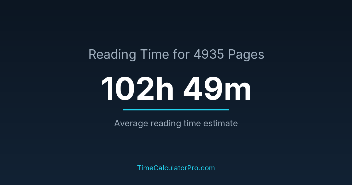 If you read at an average speed of 200 words per minute, reading 4935 pages will take approximately 102 hours and 49 minutes. This estimate assumes around 250 words per page, which is typical for most books.