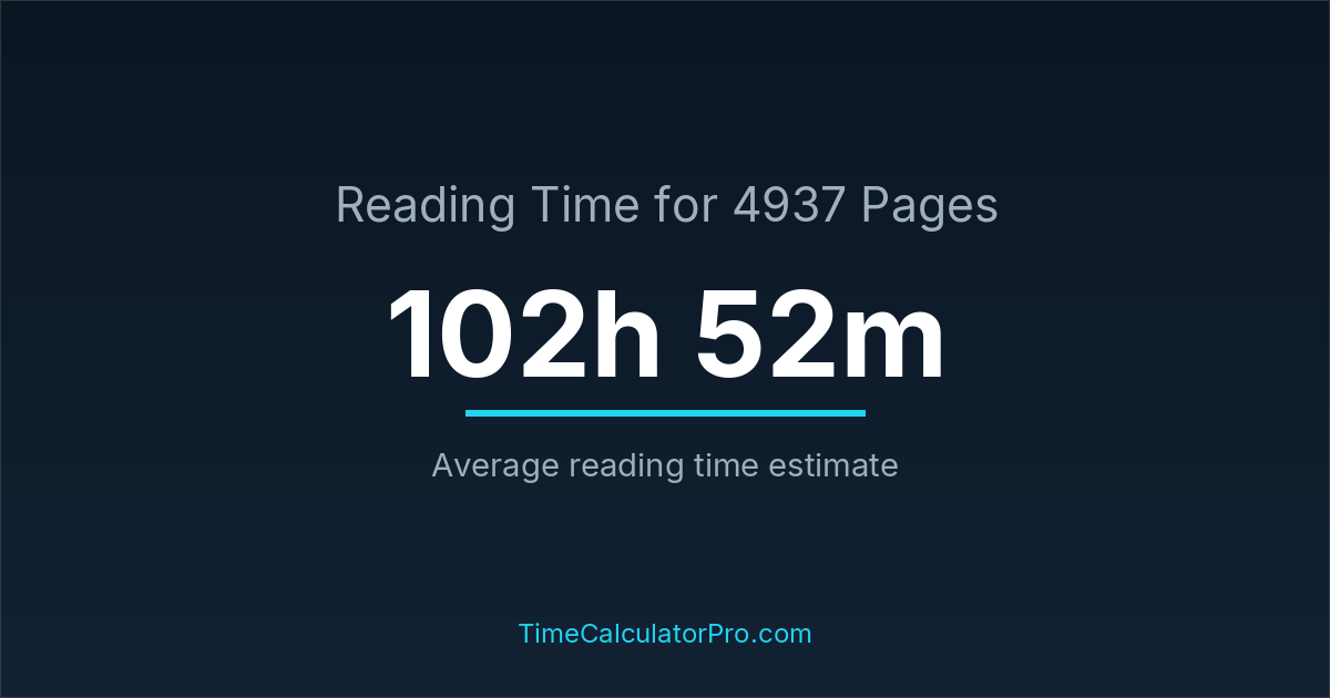 If you read at an average speed of 200 words per minute, reading 4937 pages will take approximately 102 hours and 52 minutes. This estimate assumes around 250 words per page, which is typical for most books.