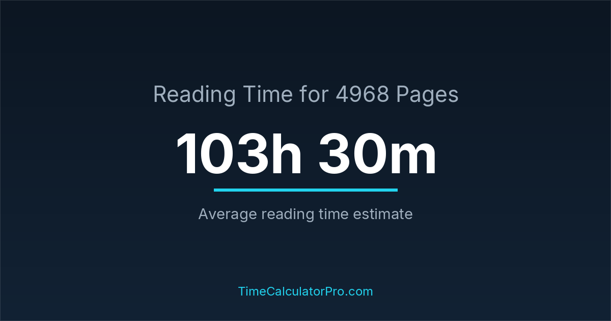 If you are wondering how long it takes to read 4968 pages, the estimated reading time is roughly 103 hours and 30 minutes based on common reading speed averages.