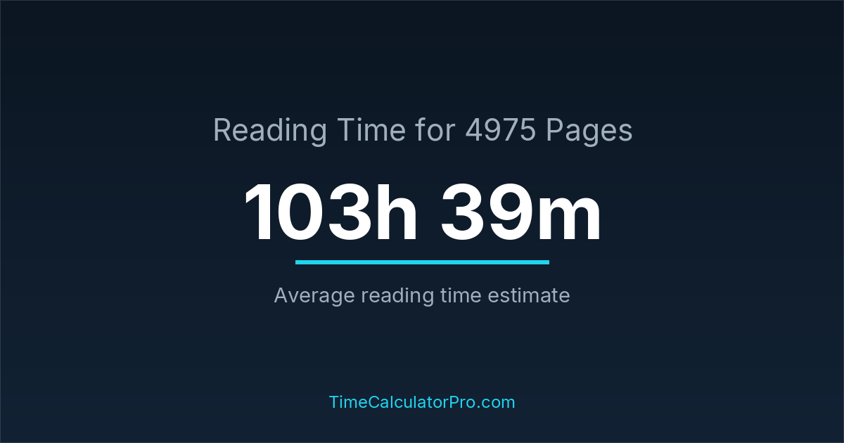 If you read at an average speed of 200 words per minute, reading 4975 pages will take approximately 103 hours and 39 minutes. This estimate assumes around 250 words per page, which is typical for most books.