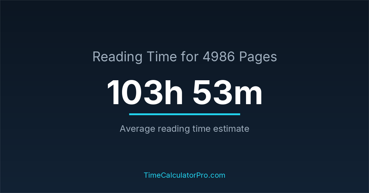 If you read at an average speed of 200 words per minute, reading 4986 pages will take approximately 103 hours and 53 minutes. This estimate assumes around 250 words per page, which is typical for most books.