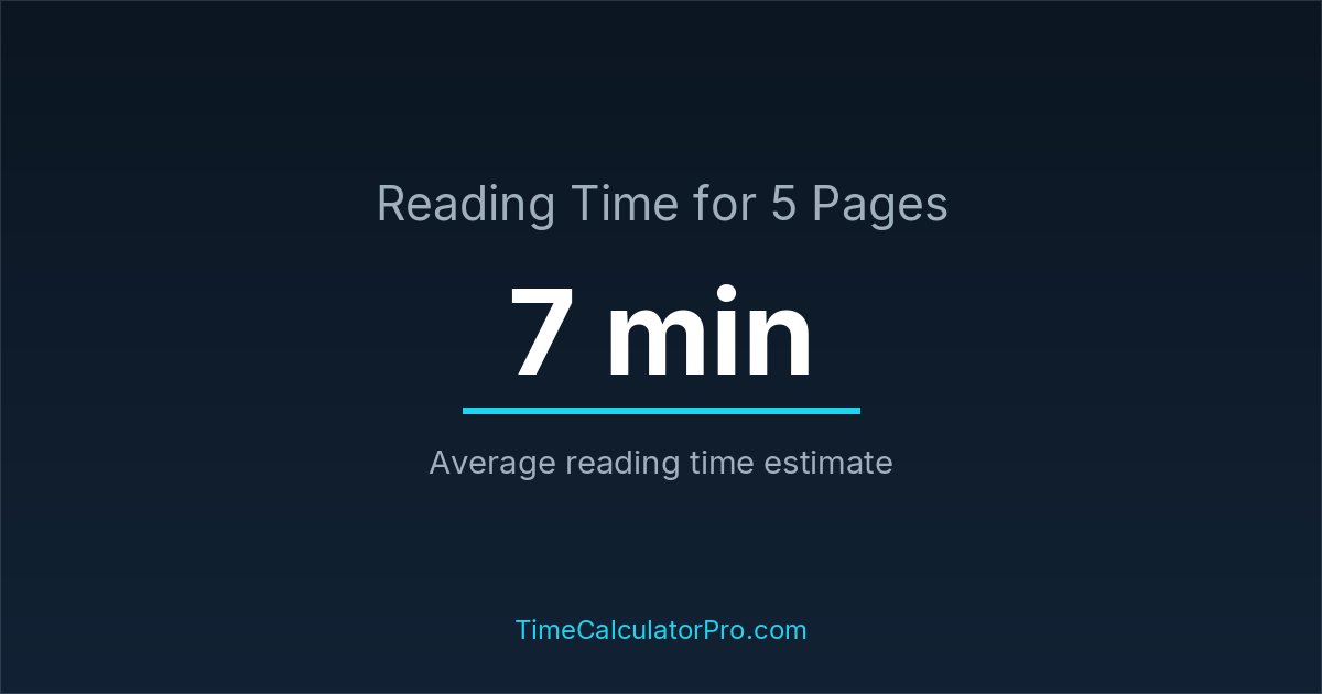 If you read at an average speed of 200 words per minute, reading 5 pages will take approximately 0 hours and 7 minutes. This estimate assumes around 250 words per page, which is typical for most books.