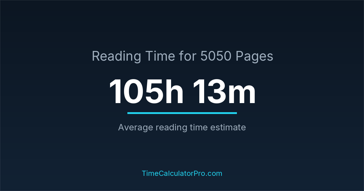 If you are wondering how long it takes to read 5050 pages, the estimated reading time is roughly 105 hours and 13 minutes based on common reading speed averages.