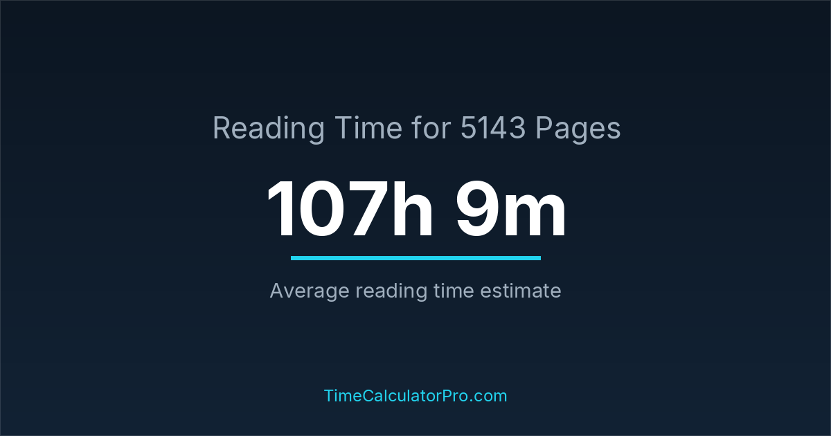 Reading 5143 pages usually takes approximately 107 hours and 9 minutes for the average reader, though this can vary depending on concentration and reading habits.