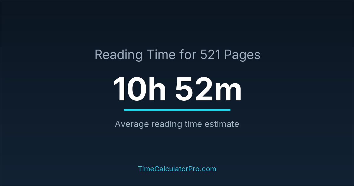 If you read at an average speed of 200 words per minute, reading 521 pages will take approximately 10 hours and 52 minutes. This estimate assumes around 250 words per page, which is typical for most books.