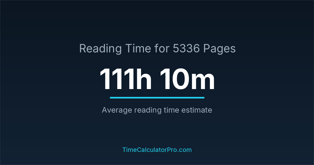 On average, reading 5336 pages may require about 111 hours and 10 minutes for most readers, assuming a standard reading pace and moderate difficulty.