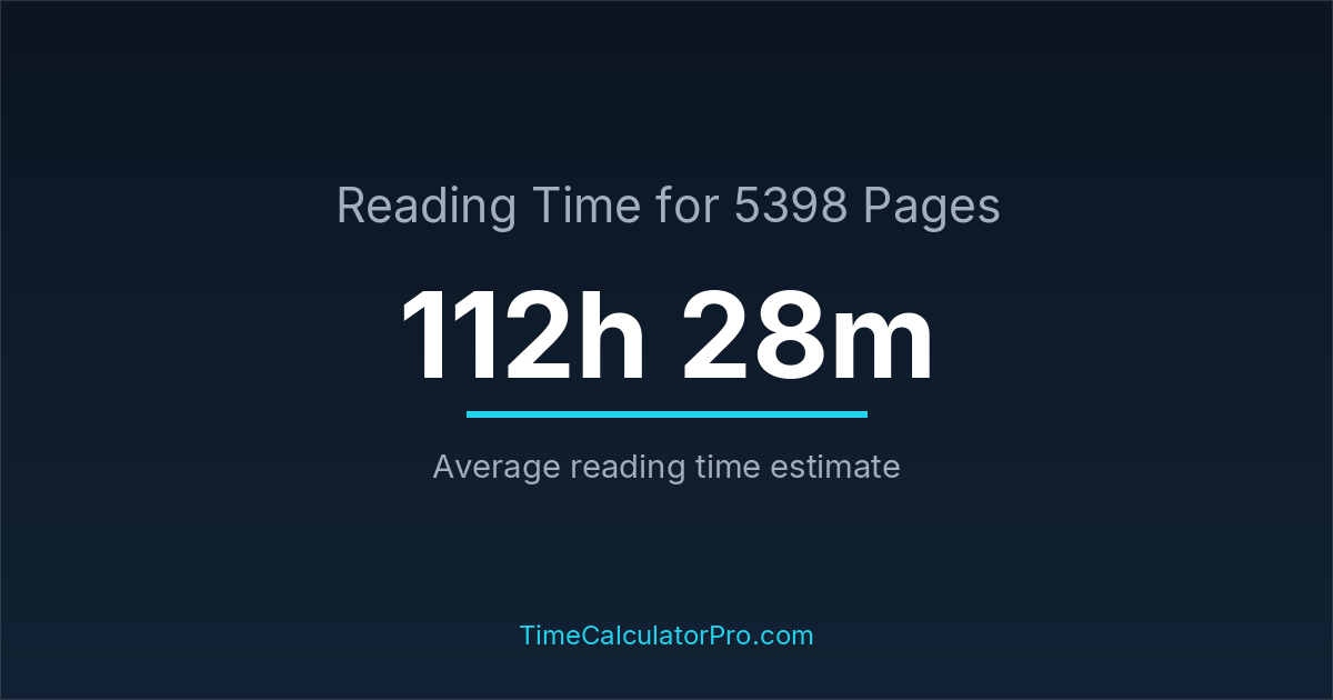 If you read at an average speed of 200 words per minute, reading 5398 pages will take approximately 112 hours and 28 minutes. This estimate assumes around 250 words per page, which is typical for most books.