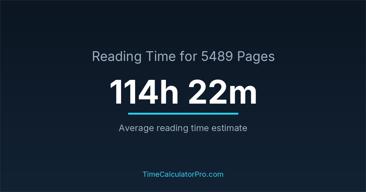 On average, reading 5489 pages may require about 114 hours and 22 minutes for most readers, assuming a standard reading pace and moderate difficulty.