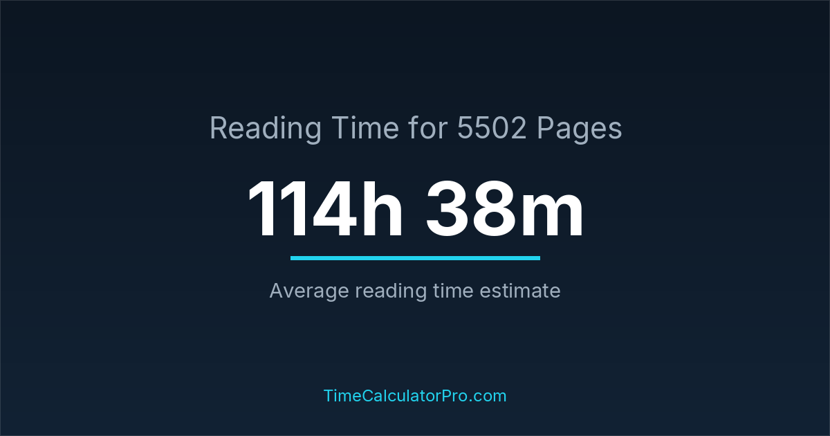If you read at an average speed of 200 words per minute, reading 5502 pages will take approximately 114 hours and 38 minutes. This estimate assumes around 250 words per page, which is typical for most books.