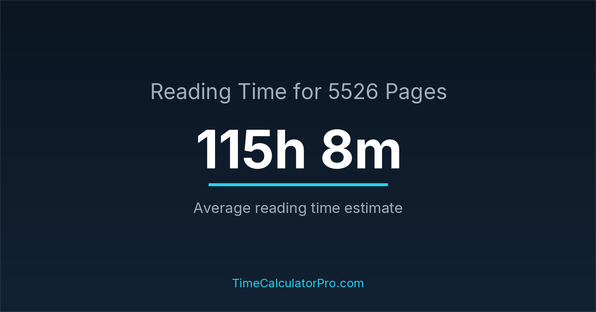 If you read at an average speed of 200 words per minute, reading 5526 pages will take approximately 115 hours and 8 minutes. This estimate assumes around 250 words per page, which is typical for most books.
