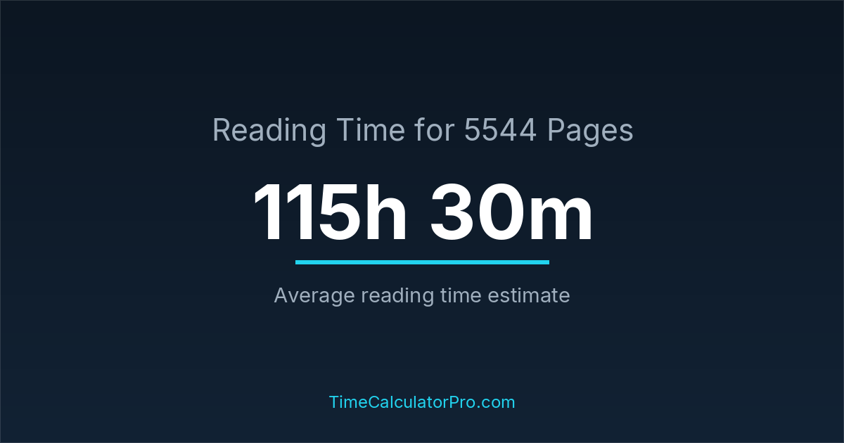 If you read at an average speed of 200 words per minute, reading 5544 pages will take approximately 115 hours and 30 minutes. This estimate assumes around 250 words per page, which is typical for most books.